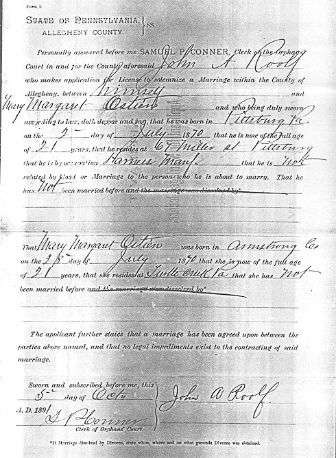 Brian B. Mathewson John and Margaret were married in Holy Trinity Church in Pittsburgh on 5 Oct 1891. We also have a nice wedding picture of them. See John A. Roolf and Margaret Mary Ostien for more information. This record was copied from record books kept at the Allegheny County Recorder's Office. This and other records are public information, and copies can be requested for a nominal fee. See the Allegheny County WebSite for more information.