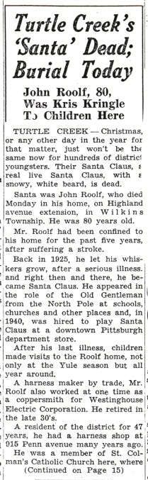 John A. Roolf's PassingWell known in Turtle Creek and in Pittsburgh for his role playing Santa Claus in downtown department stores and to children in Turtle Creek, John Roolf passed away on 12 Mar 1951. He was born and raised in Pittsburgh, and took his father Joseph's profession as a saddle and harness maker.