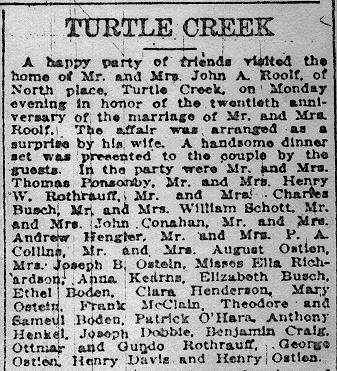 Courtesy of Paul Amedick This is a clipping from a 1911 Pittsburgh newspaper about a wedding anniversary party for John A. and Margaret Roolf. Many of the guests were family members, including the Ostien's, Hendersons, Bodens, and Davis's.John A. Roolf and Margaret Mary Ostien were married on 5 Oct 1891 in Holy Trinity Church, Pittsburgh, PA. |
